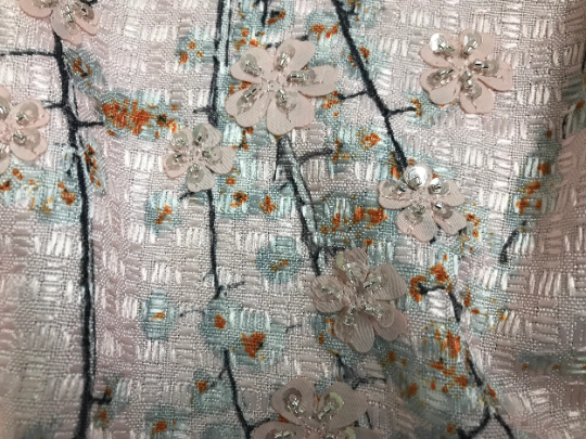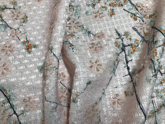 Pale Pink Floral with Flowers Appliques and Glass Beads - French Tweed - 150 cm Wide.
