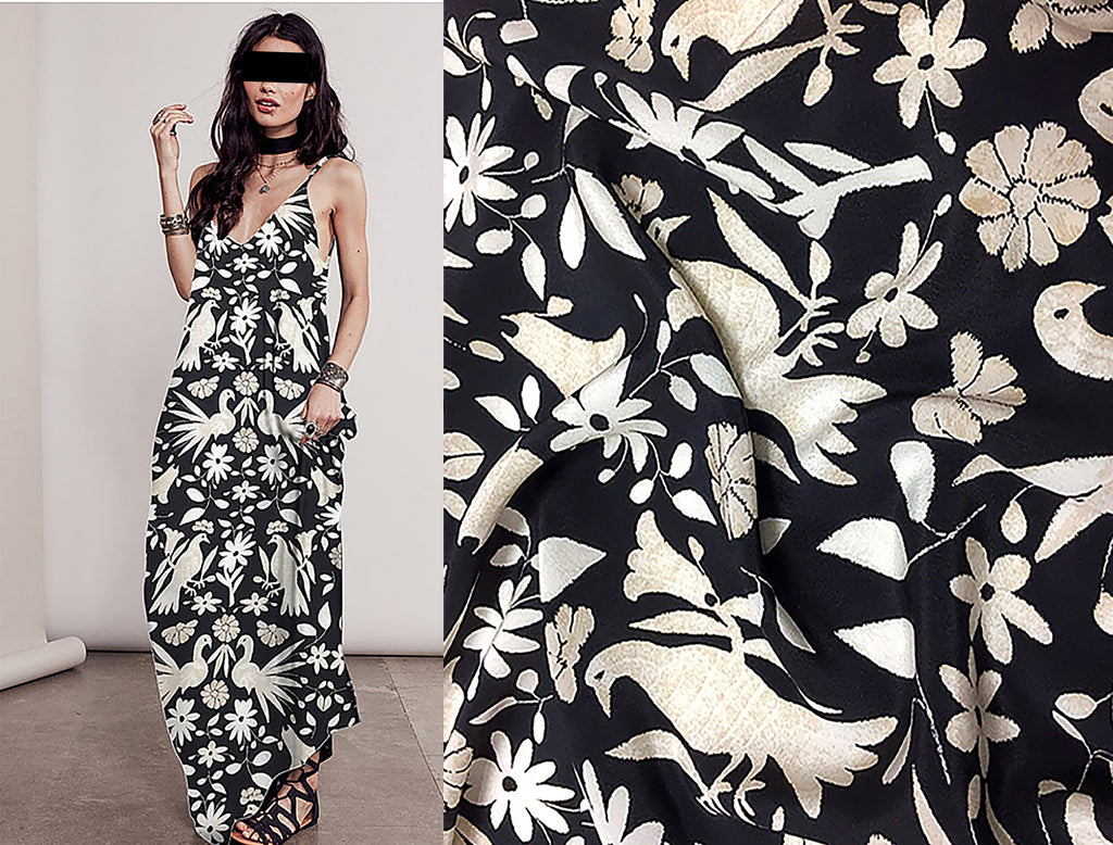 Gorgeous Off White/Beige Birds Floral Print on Black Background- Mulberry Silk Crepe de Chine - 16 MM, 152 cm Wide.