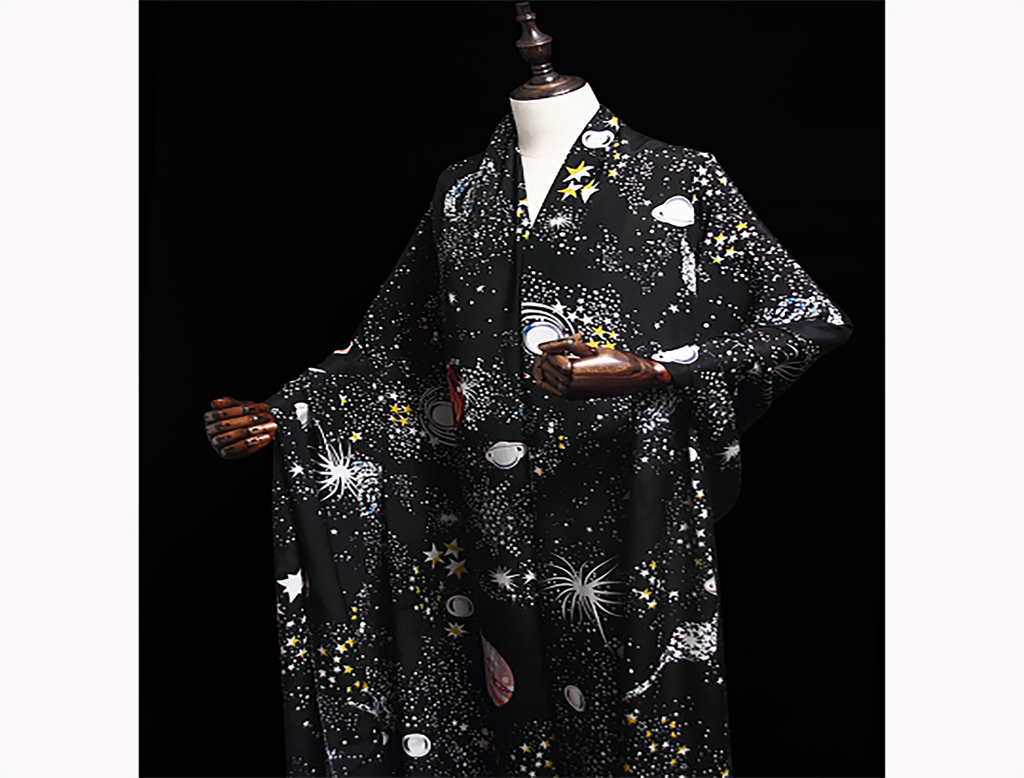 Gorgeous Starry Night Print on Black Background - Mulberry Silk Double Crepe de Chine, 16 mm - 108 cm Wide, Imported.