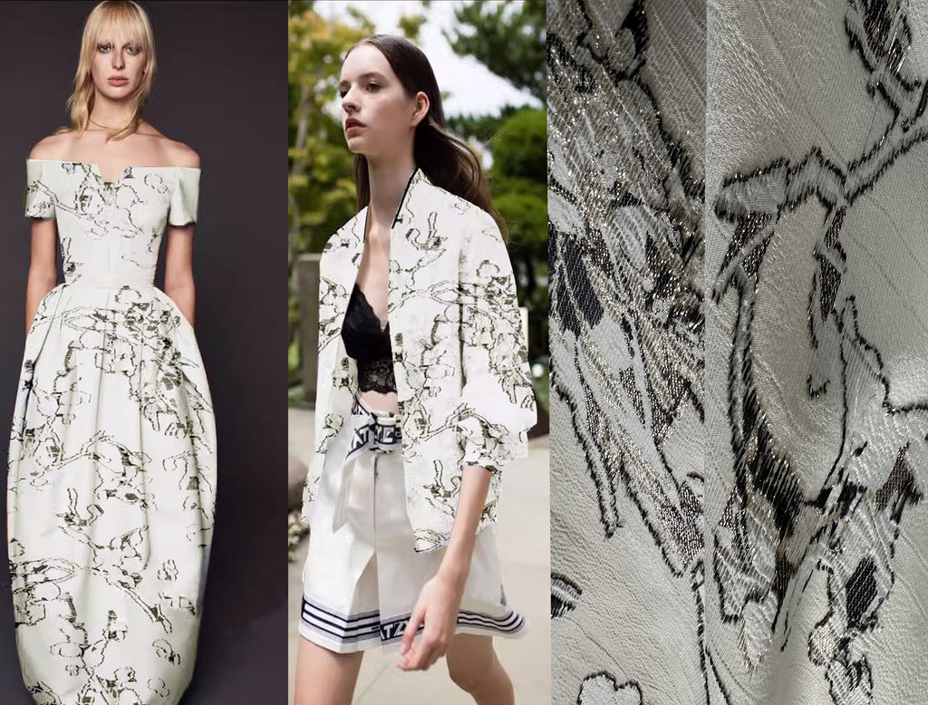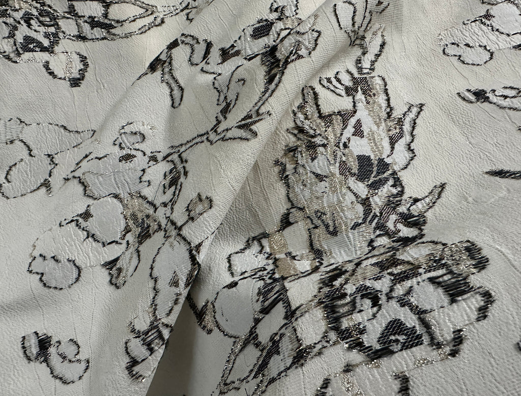 Dark Grey w/Gold Lurex Filigree on Off White Background - 3D French Jacquard Fabric - 150 cm Wide.