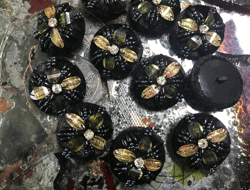 Black Velvet Hand-Made - With Gold/Black Beads and Crystal - Embroidered Button - 34 MM Width.