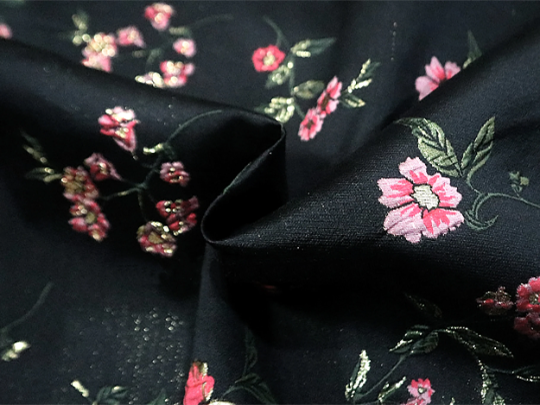 Multi Colors Floral w/Gold Filigree on Black Background - 3D Italian Jacquard Fabric.