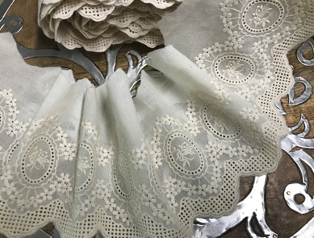 Ivory/Beige Medallions Embroidery on Beige Cotton Voile - Broderie Anglaise - 12.5 cm Wide.