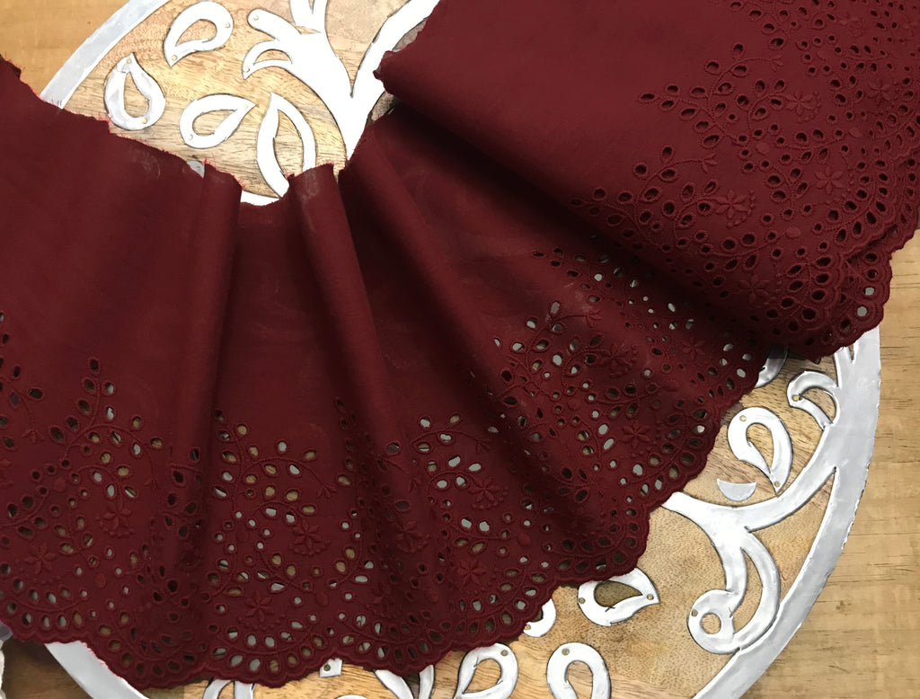 Burgundy Broderie Anglaise Lace on Cotton Voile - 19.5 cm Wide.
