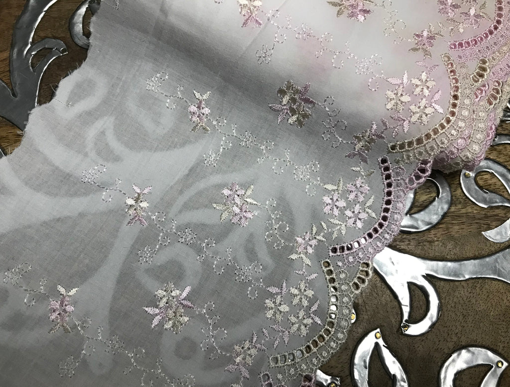 Pink and Beige Hombre with Shinny Thread Embroidery on Natural White Cotton Voile - Broderie Anglaise - 17 cm Wide.