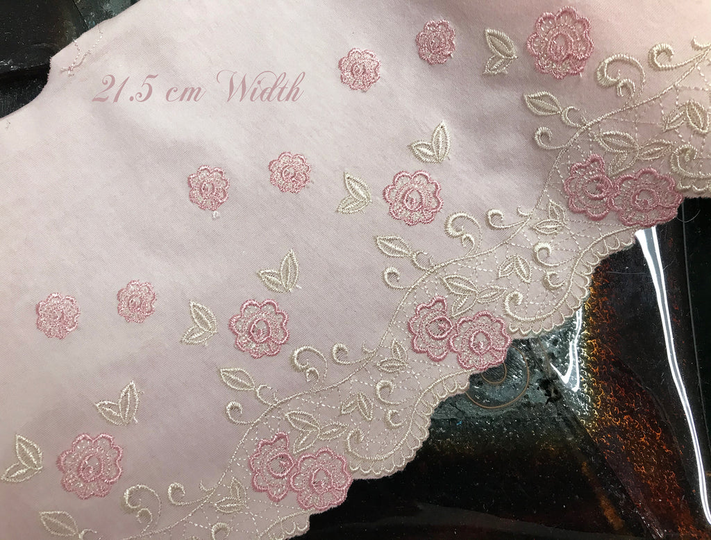 Pink/Beige Embroidery on  Cotton Knit Embroidered Lace - 21 cm Wide.