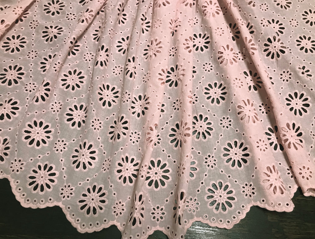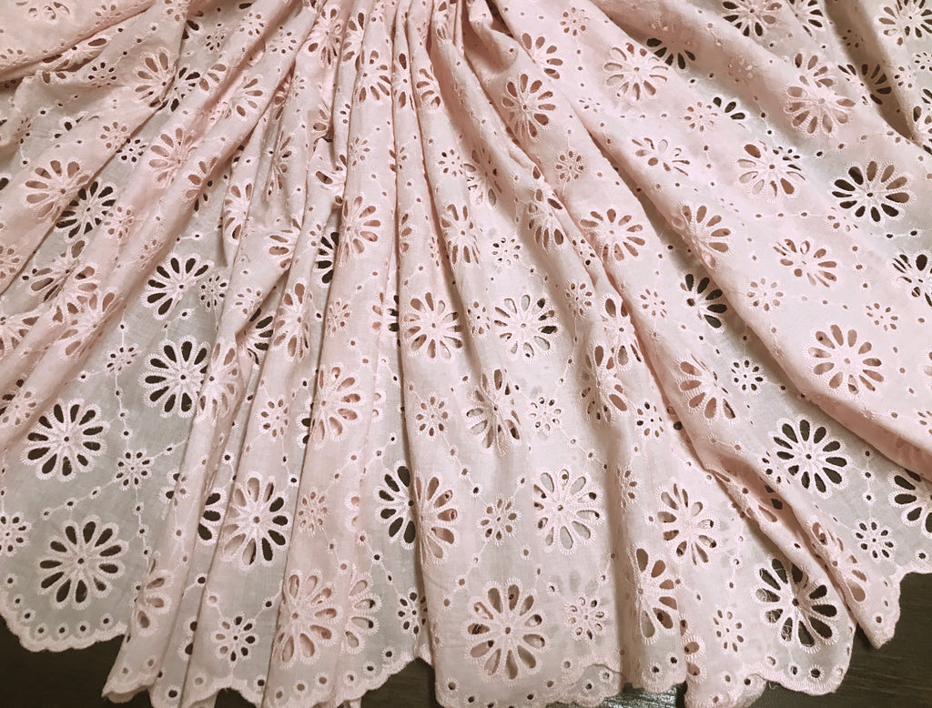 Pink All Over Small Daisy Pattern Embroidery - Scalloped on Both Sides - Broderie Anglaise on Swiss Cotton Voile - 130 cm Wide.