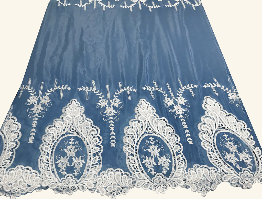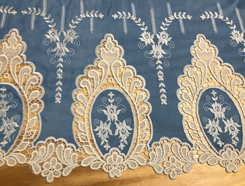 White Embroidery  on Sky Blue Silk/Cotton Background - Double Border -  Broderie Anglaise - 118 cm Wide.