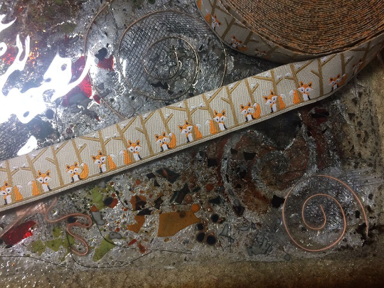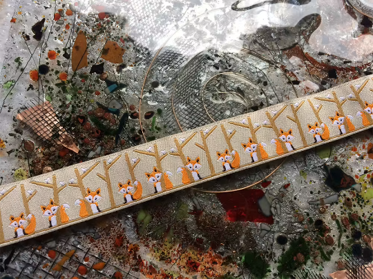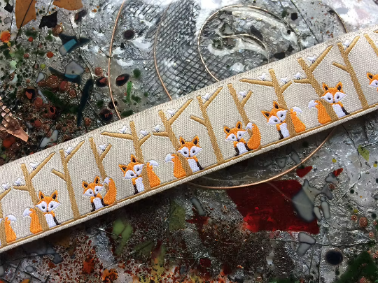 Foxes and Trees on Beige Background- Embroidered Jacquard - Two Sizes: 7/8" Wide and. 1 1/2" Wide.