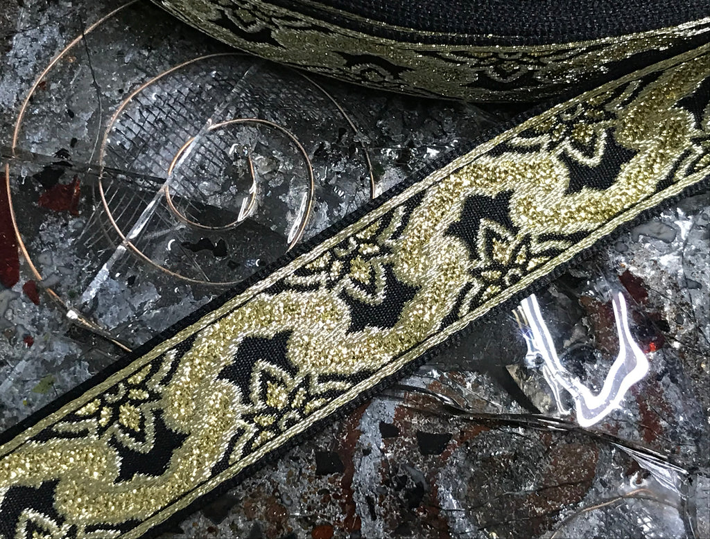 Gold on Black Background - Embroidered Jacquard Ribbon - 1.1" Wide.