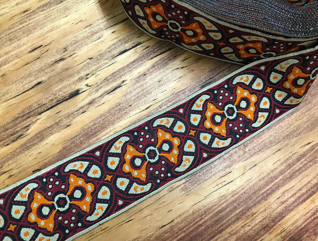 Black/Beige/Orange on Marron Background - Jacquard Ribbon -1 7/8" Wide.