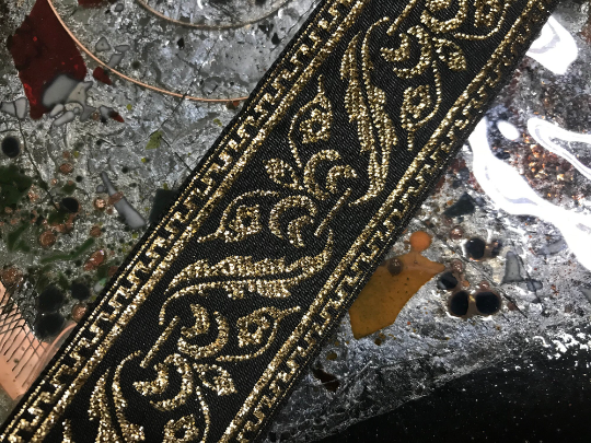 Metallic Gold on Black Background - Embroidered Jacquard Ribbon - 1 3/8" Wide.