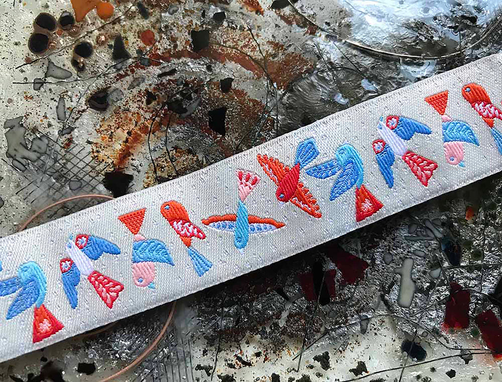 Multi Color Birds on Off White Background - Embroidered Jacquard Ribbon - 1.5" Wide.