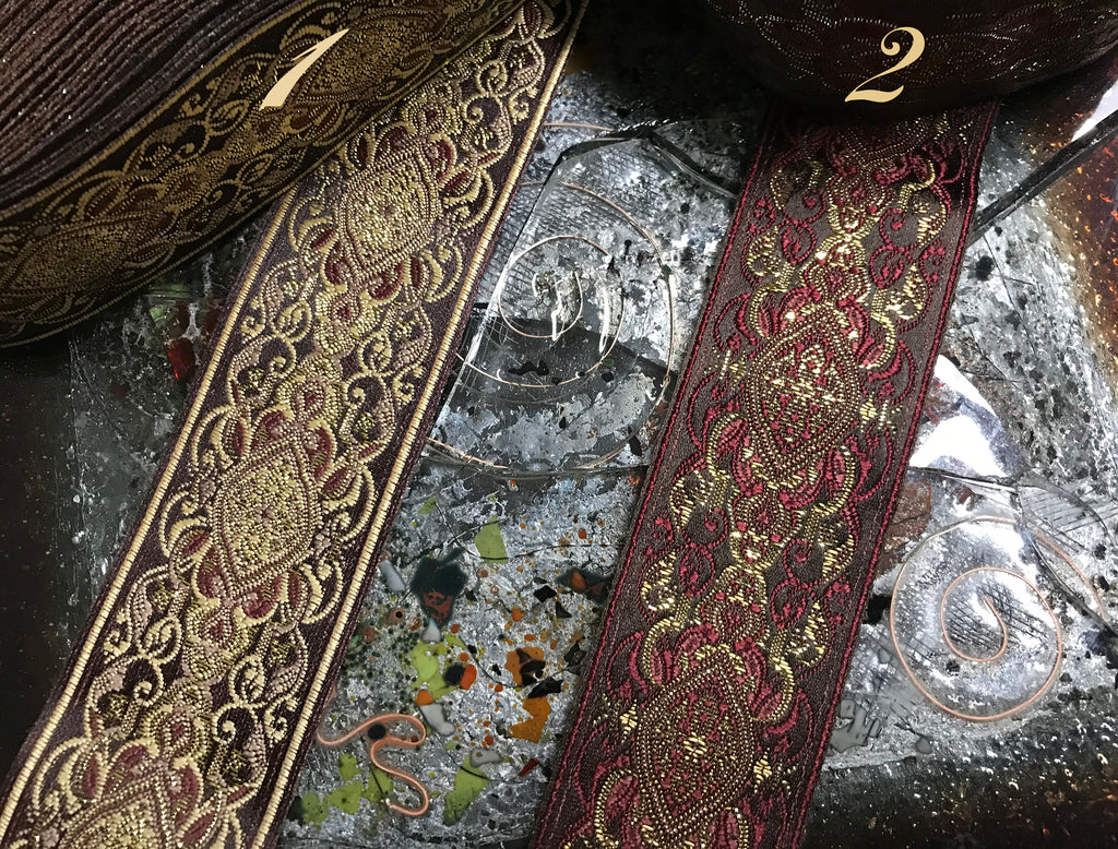 Multi Color Shinny w/Metallic Filigree on Brown Background - Embroidered Jacquard Ribbon - 5 cm Wide, In 2 Colors