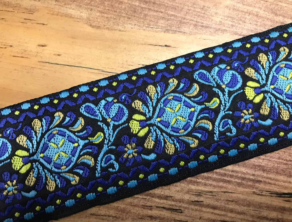 Shades of Blue/Orange/Yellow on Black Background - Embroidered Jacquard Ribbon - 5 cm Wide.