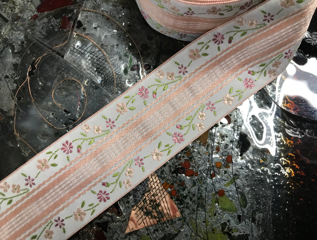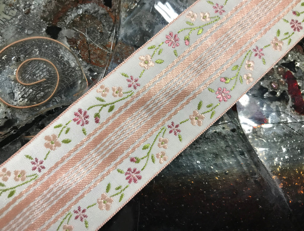 Shades of Pink on Natural Background - French Embroidered Jacquard Ribbon - 1.5" Wide.