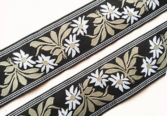 White and Tan Flowers on Black Background - Embroidered Jacquard Ribbon - 3.9 cm Wide.