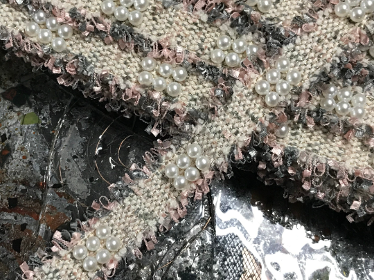 Shades of Pink/Grey/Off White Gold Stitching and Pearls Studs and Pearls - French Trim - 3 cm Wide.