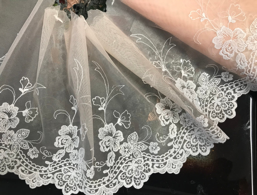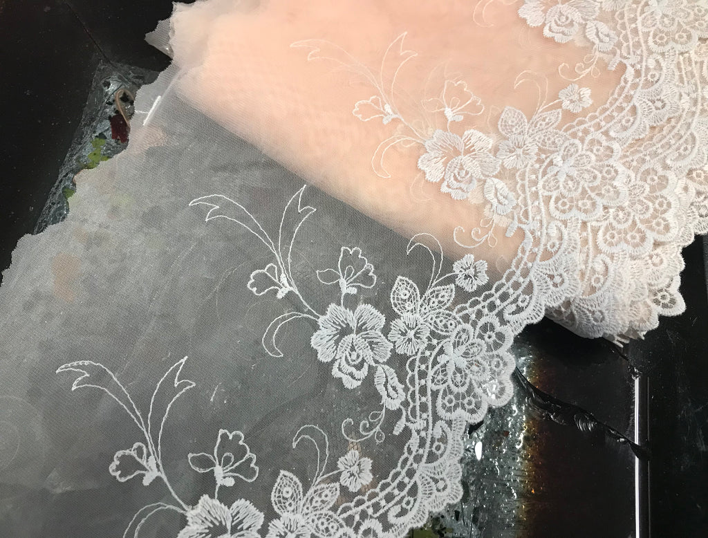 White Embroidery on Peach Powder Background - Embroidered Soft Tulle Lace - 18.5 cm Wide.