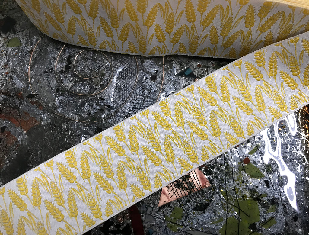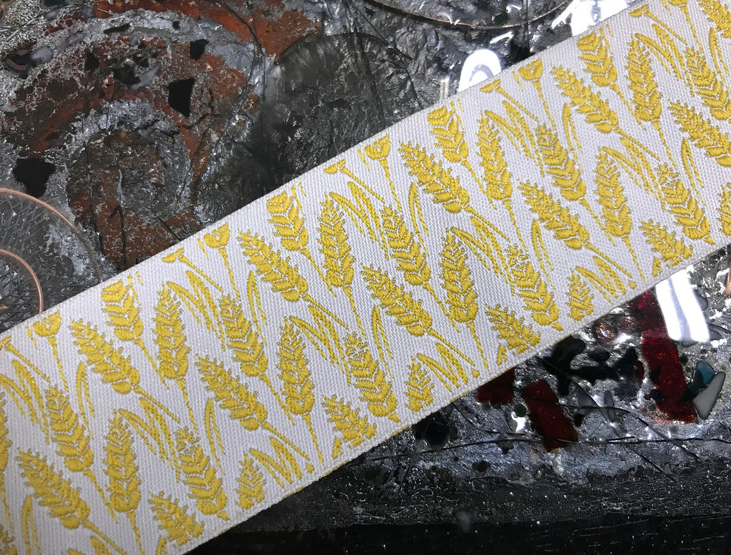 Yellow Wheat Spears on Natural White Background - Embroidered Jacquard Ribbon -