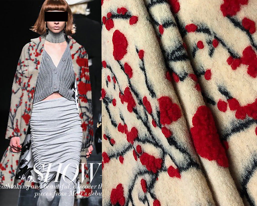 Red and Black Floral on Ivory/Blush Background - Italian Woolen - 150 cm Wide.